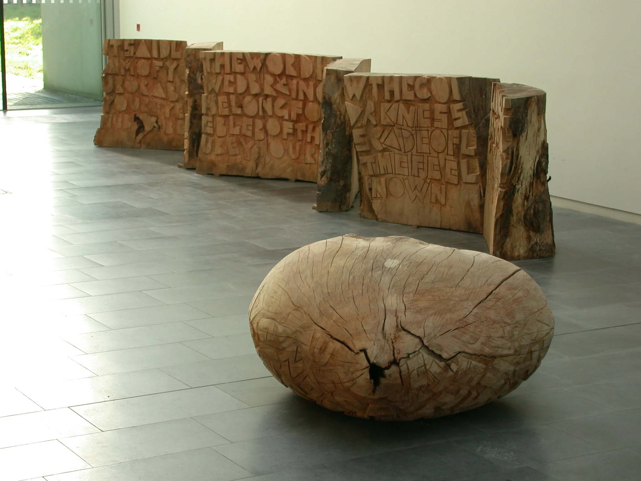 Jeg har her åbnet dette stykke af den gamle bøgestamme fra Durrow Abbey med 5 snit og opstillet delene som en foldet bog på.120 x 600 x 150 cm. Denne skulptur er beskrevet på den ene side med et citat fra Seamus Heaneys digt ”North”, som jeg har fået den irske nobelpristagers personlige tilladelse til at indlejre i træet.
