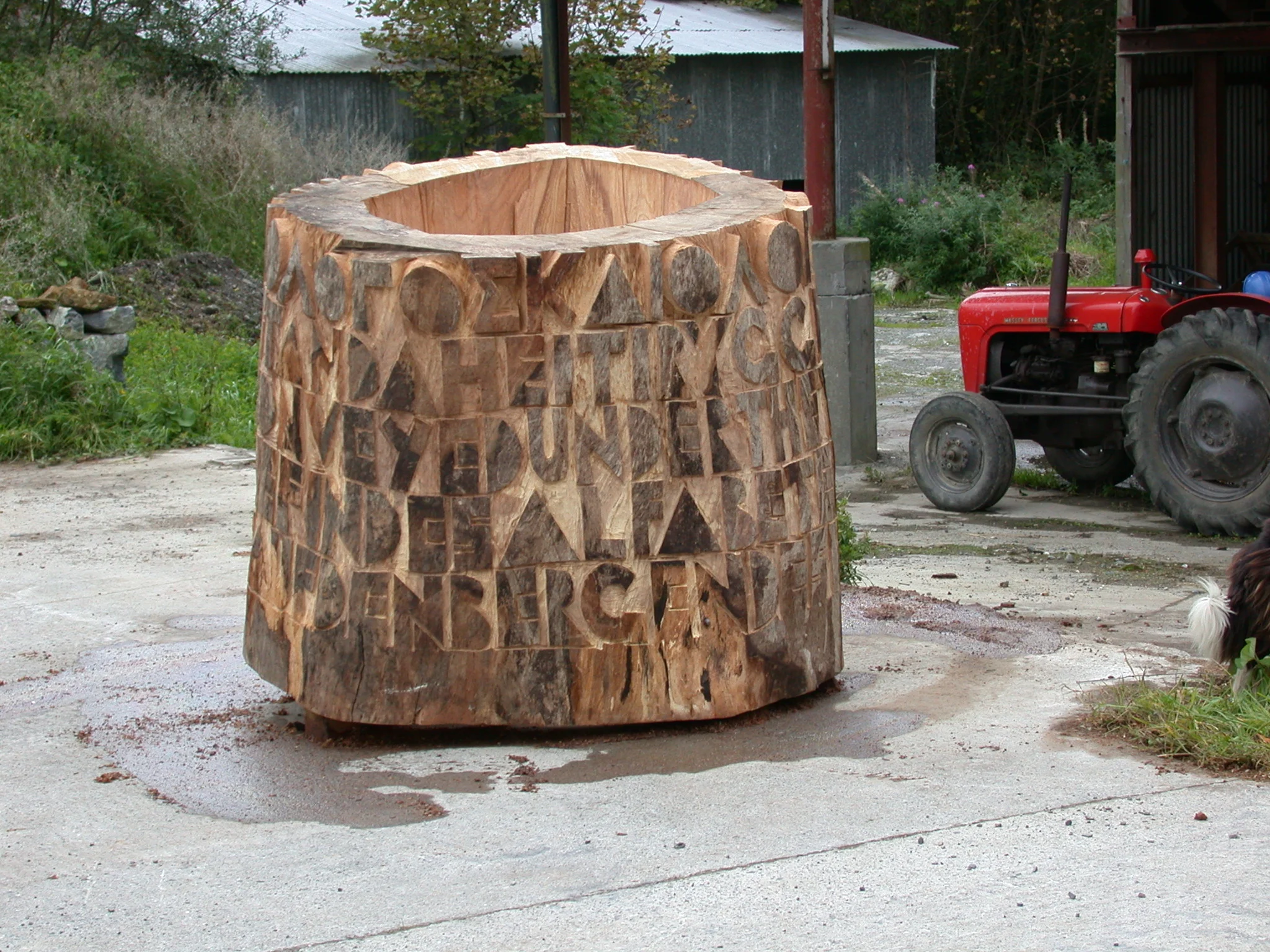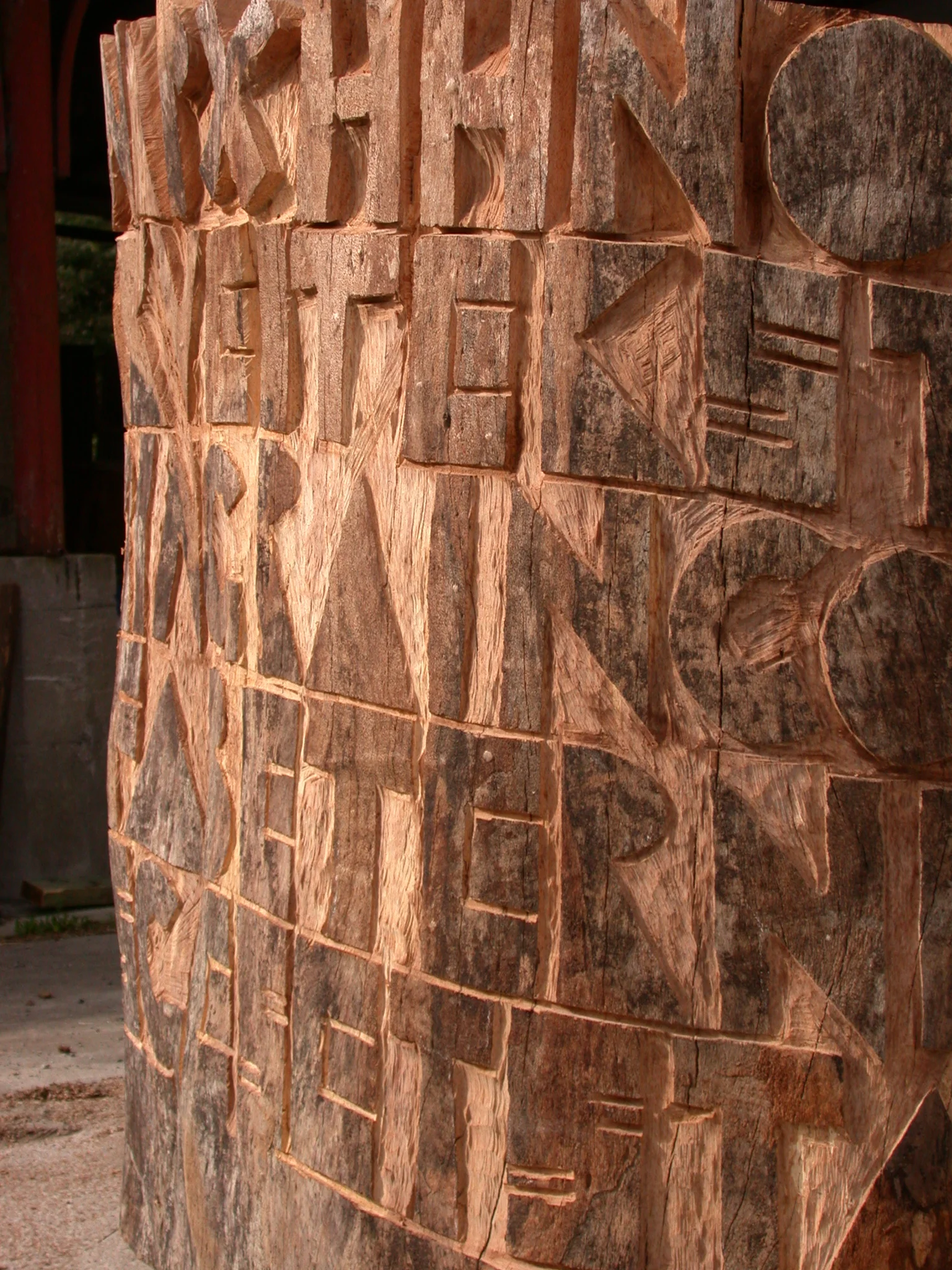 Et nærbillede af skriften på skulpturen lige da den blev skabt. Bemærk at bogstavernes relief er dybest i toppen og bliver mindre nedover og nederst er kun træets egen “skrift” tilbage.